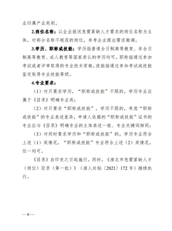 《淮北市急需紧缺人才目录(第二批)》自印发之日起施行。同时,《淮北市急需紧缺人才(岗位)目录(第一批)》(淮人社秘〔2021〕172 号)继续执行。